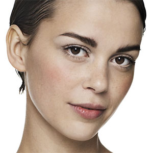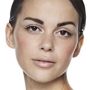 4. Sart rosa blush lægges midt på kinden. Læberne lysnes, så kinderne fremhæves, highlights tilføres i ansigtet.