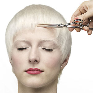 2. Start i fronten, og frisér blødt frem, og klip lige af på huden. Start ved tindingen, og klip mod midten.